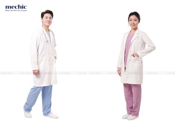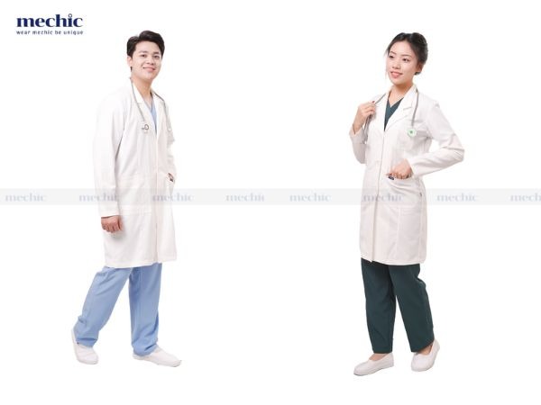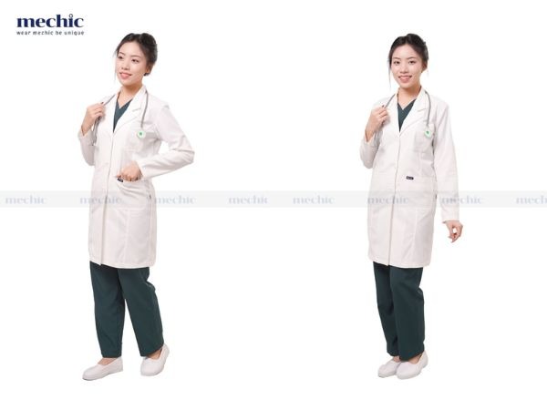 Đặc biệt, Mechic còn mang đến nhiều tùy chọn về kiểu cổ áo, độ dài tay, số túi và màu sắc để phù hợp với từng môi trường làm việc. Một số cơ sở y tế còn chọn phối màu nhẹ nhàng (như xanh mint hoặc trắng ngà) thay cho trắng truyền thống để tạo điểm nhấn riêng biệt.